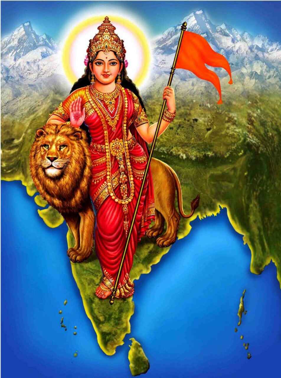 Bharat Mata (Bhārat Mātā, Mother India in English) is a national personification of Bharat as a mother goddess. Bharat Mata is commonly depicted dressed in a saffron-coloured sari and holding a saffron flag; she stands with accompanied by a lion.